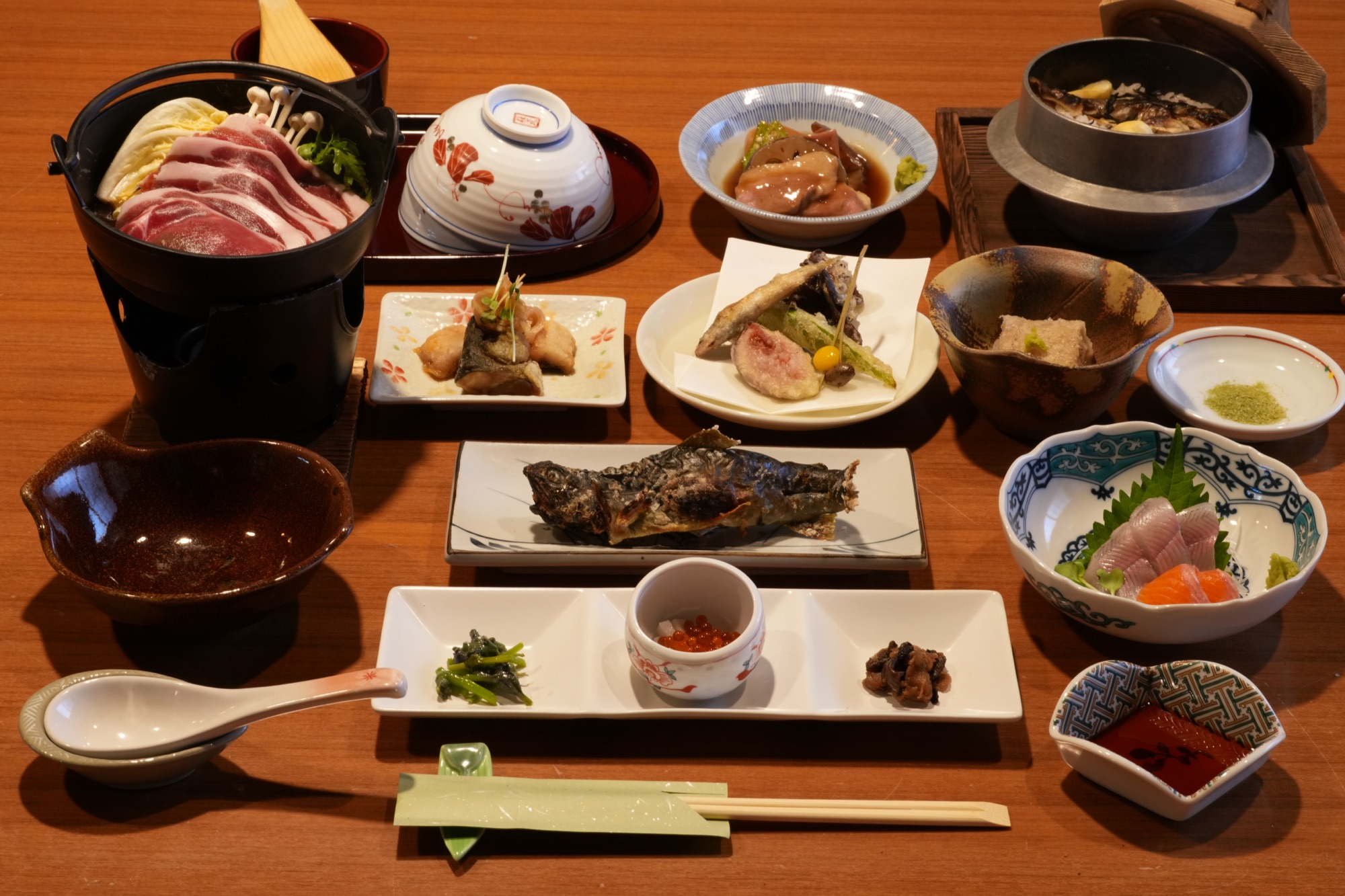 ▲銭がめコース(川魚の洗い、川魚の塩焼き、ミニぼたん鍋、季節の小鉢、旬菜の天ぷらなど 全十六品)